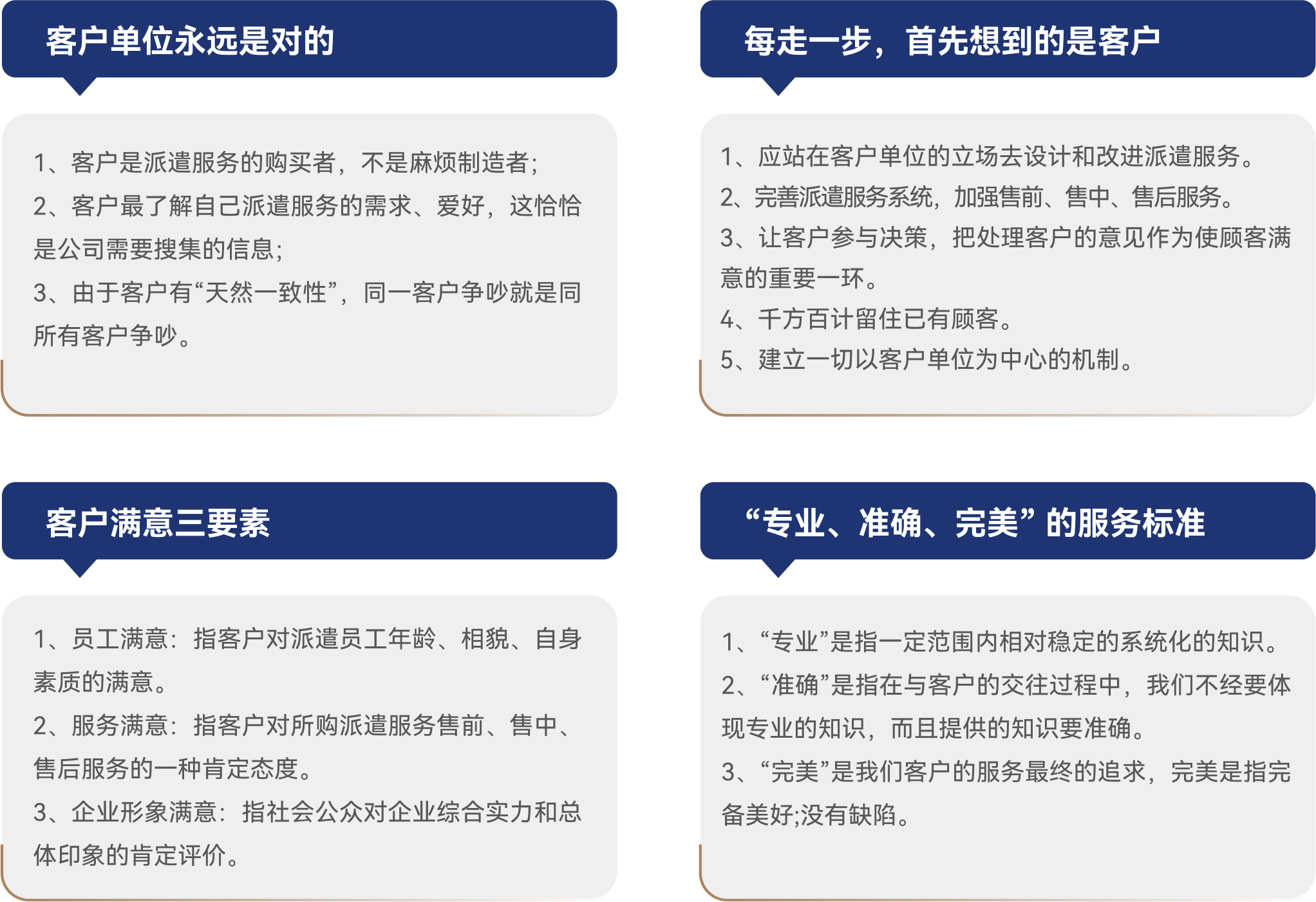 客户服务的基本标准:有内涵的服务:专业、准确、完美,为企业提供全方位的人力资源解决方案。